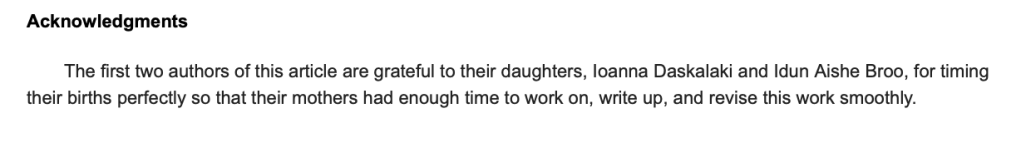 It was so exciting, this whole process. Whenever I had to rest she took over and when she needed I did the same. We finalized the article just when Ioanna was 2 months old and Idun was 4. So we added the best acknowledgment one can have in any scientific article. Sorry, all the proofreaders, PIs, funding agencies, and all! You can never compete with babies 😀